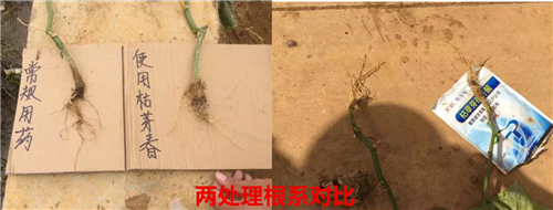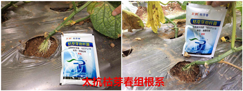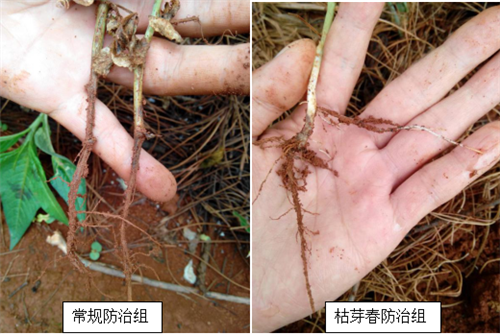 常規(guī)防治組死根更嚴(yán)重,植株開始枯萎;枯芽春組已經(jīng)開始長出新須根,植株健康