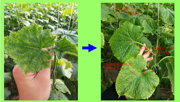 黃瓜苗定植澆定植水時進(jìn)行土蘇TM灌施,疏松土壤,促進(jìn)緩苗,使用方法為:稀釋土蘇TM500~800倍,調(diào)整出藥速度,畝用量為1L。