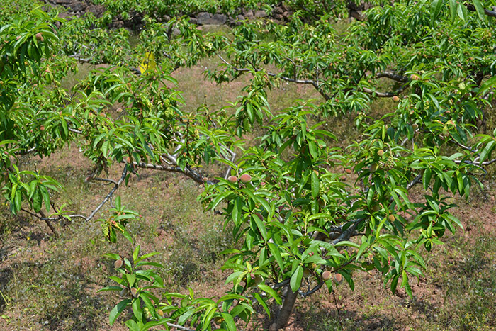 常規(guī)處理的對照桃樹 – 枝葉稀疏,桃葉卷曲